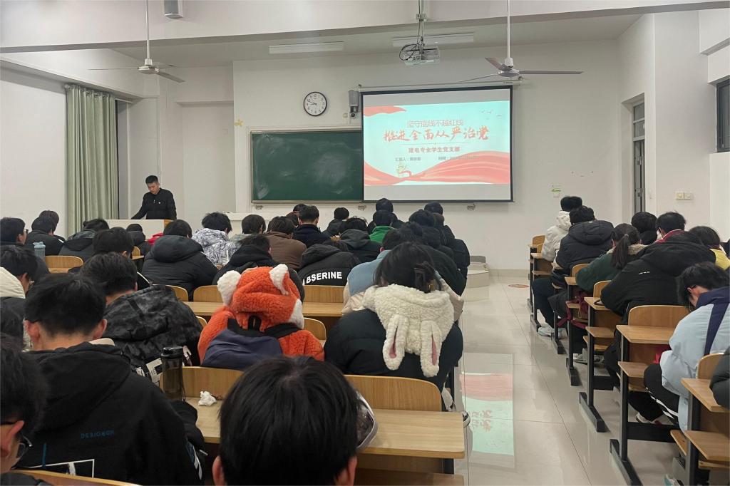为学习贯彻习近平总书记在二十届中央纪委二次全会上的重要讲话精神,落实全面从严治党和党风廉政建设。2023年12月21日,电气与电子工程学院建电专业学生党支部开展“全面从严治党与党风廉政建设”专题报告会,支部全体党员及2023级建电专业全体新生参加。