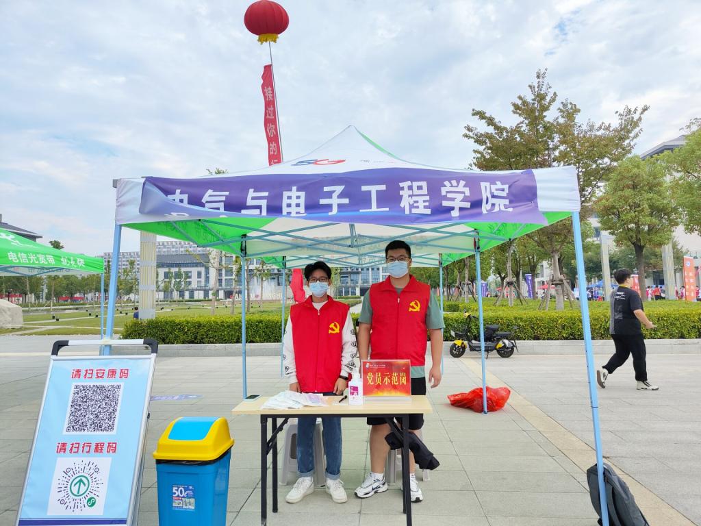 电气与电子工程学院迎新接待处,党员们身着学院志愿者服装,佩戴党员徽章,主动亮明党员身份,喷洒消毒水、接待引导、搬运行李,紧张而又有序地忙碌着。为打消新生刚来到陌生环境的不安和拘束,支部党员热情主动与他们展开交流,详细为他们讲解学校办学历程、学院专业设置、日常生活注意事项等问题。在党的二十大召开之际,支部党员结合个人的入党经历对新生们讲述了入党心得,介绍了党的相关理论知识,并鼓励新生们努力奋斗,不负韶华,积极向党组织靠拢。
