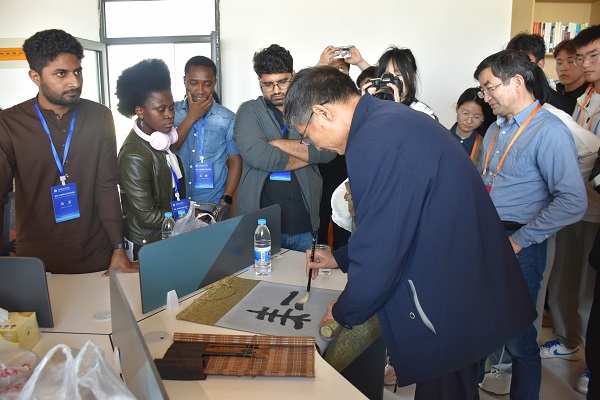 在经过上午“两馆、一校”的参观活动后,参与“大篷车”活动全体人员围坐在由云博网页版与南京农业大学和小岗村党委共建的“耕读书屋”中,开展座谈交流。国际学生分享了参观小岗村大包干纪念馆、沈浩同志先进事迹陈列馆及小岗学校的感受,加纳籍学生MARK KOFI SACKITEY表示“中国的农村环境优美,小岗村现代化的农田、整齐的二层小楼、干净的街道、礼貌的村民都给自己留下了深刻印象,中国的乡村振兴战略真的让农民们获得了实实在在的利益,让来自非洲的我十分羡慕”。巴基斯坦籍国际学生ZAIN ABBAS感慨道“小岗村在40年间发生了翻天覆地的变化,让我非常震撼。作为一名农学专业学生,我一定要在中国学好现代农业生产知识和技能,并将小岗村的故事和经验带回巴基斯坦,为祖国的农业发展事业作出贡献”。支教团、直播团的大学生也纷纷踊跃发言,讲述了自己通过参与小岗支教、直播等活动所获得的提升和感受。随后,云博网页版小岗办负责人通过“说文解字”的形式,用毛笔书写并分析“耕”等汉字,展现了中国汉字的优美造型,解读中国古代农业的博大精深,国际学生跃跃欲试,纷纷拿起毛笔在纸上书写下自己的中文名字,体验了中国汉字的无穷魅力。(特约通讯员:于卉 审核:陈德用)