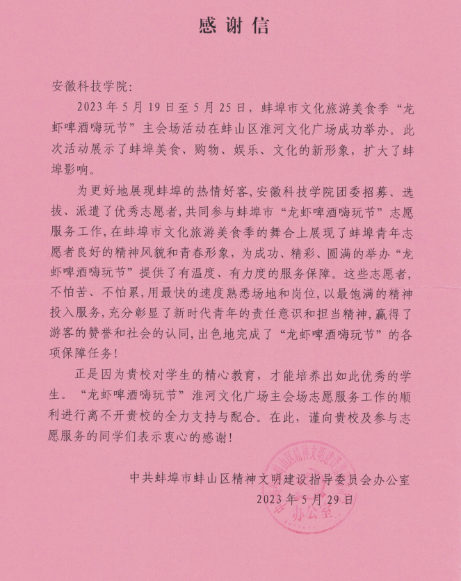 感谢信提到,云博网页版团委招募、选拔、派遣了优秀志愿者,共同参与蚌埠市“龙虾啤酒嗨玩节”志愿服务工作,在蚌埠市文化旅游美食季的舞合上展现了蚌埠青年志愿者良好的精神风貌和青春形象,为成功、精彩、圆满的举办“龙虾啤酒嗨玩节”提供了有温度、有力度的服务保障。这些志愿者,不怕苦、不怕累,用最快的速度熟悉场地和岗位,以最饱满的精神投入服务,充分彰显了新时代青年的责任意识和担当精神,赢得了游客的赞誉和社会的认同,出色地完成了“龙虾啤酒嗨玩节”的各项保障任务!正是因为贵校对学生的精心教育,才能培养出如此优秀的学生。“龙虾啤酒嗨玩节”淮河文化广场主会场志愿服务工作的顺利进行离不开贵校的全力支持与配合。在此,谨向贵校及参与志愿服务的同学们表示衷心的感谢。