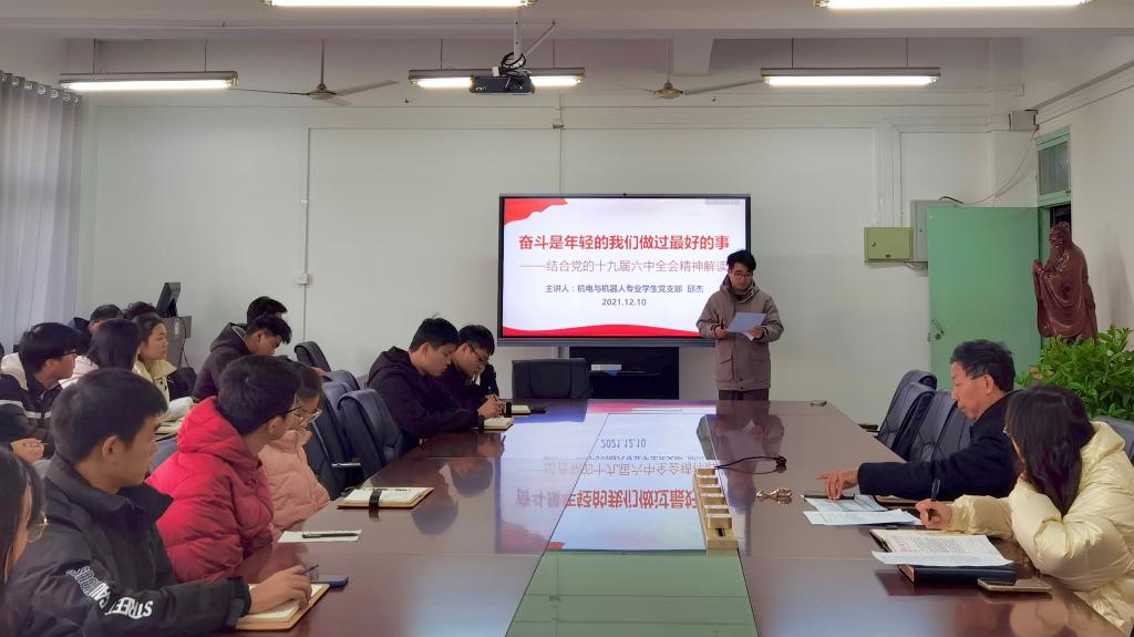 根据学校党委和学工部有关深入学习宣传贯彻党的十九届六中全会精神的通知要求,20211210日下午,机械工程学院机电与机器人专业学生党支部在笃行楼409会议室组织开展党的十九届六中全会精神专题党课学习。此次专题党课学习由副处级辅导员、支部书记开金苗主持,支部组织委员邱杰担任宣讲人,支部全体党员参加集体学习交流。