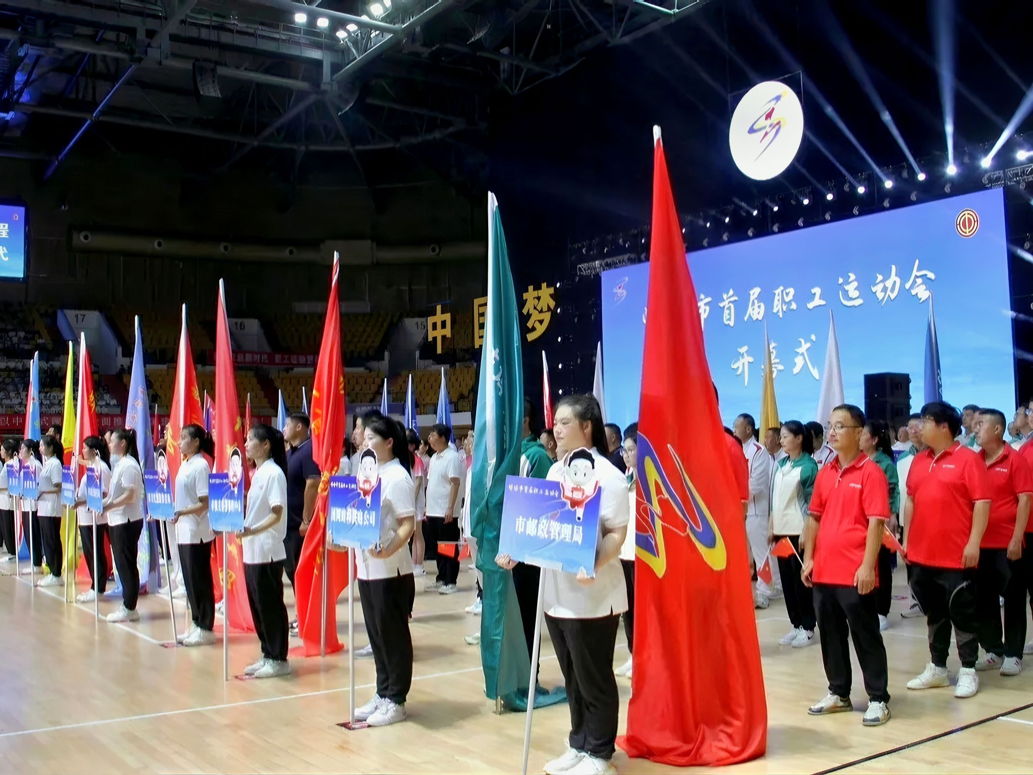在蚌埠市奥体中心举办的市职工运动会开幕式上,志愿者身穿统一服装,分布在场馆的各个关键位置,无论是入口处、休息区还是观众席旁,都能看到他们忙碌而有序的身影,让每一位参与者都能感受到便捷与温暖。