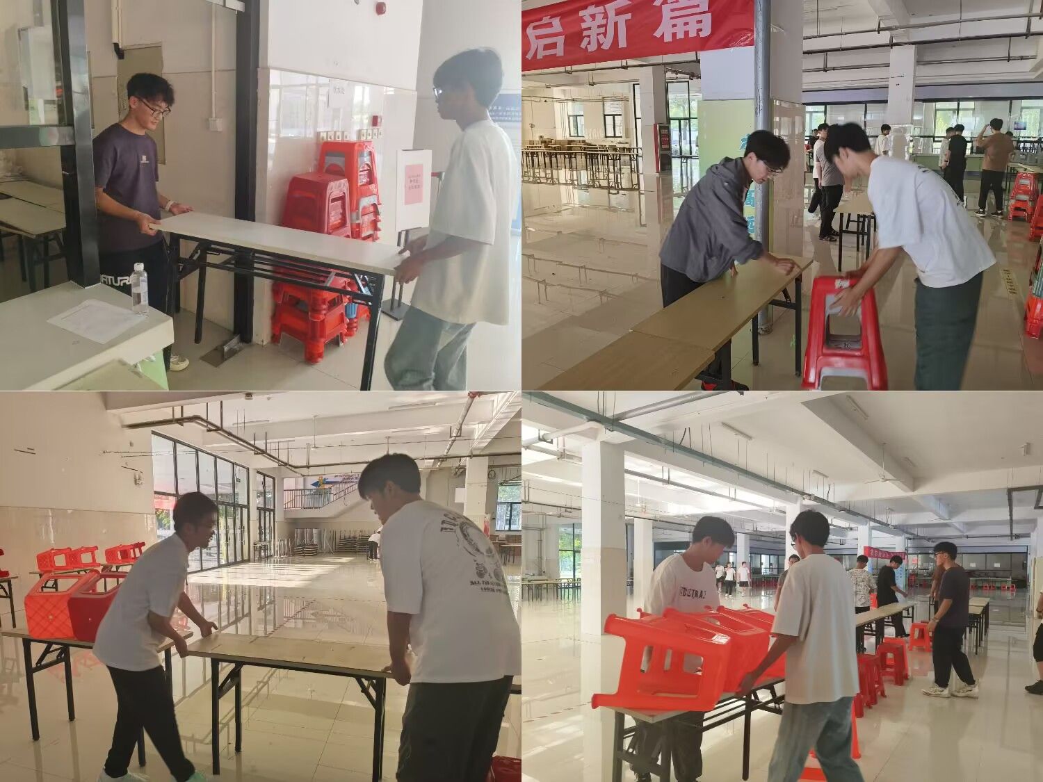 活动现场,城乡规划232班的同学们在老师的带领下先将闲杂物品搬进仓库,再对大厅进行了清扫,最后将各个学院的迎新桌椅进行有序摆放。