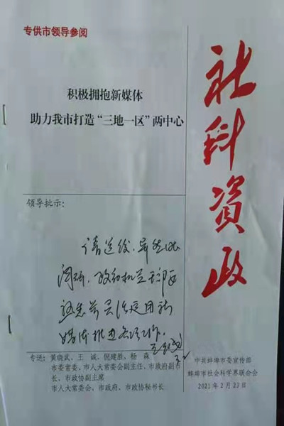 报告围绕紧紧蚌埠市委、市政府十四五期间打造“三地一区”两中心的发展战略,通过调查研究,找出领导干部在运用新媒体工具存在的问题与不足,提出积极拥抱新媒体 助力我市打造“三地一区”两中心的对策建议。报告建议把拥抱新媒体、掌握新媒体、运用新媒体作为提升领导干部执政能力的重要途径,并从“懂”、“用”、“引”、“评”四个方面提出了工作建议,对提升蚌埠市党员领导干部应对新媒体的敏锐力、表达力、行动力和驾驭力具有重要的现实意义。