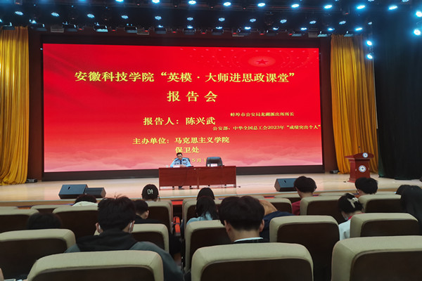 特邀刚刚获得公安部、中华全国总工会通报表扬,荣获“成绩突出个人”荣誉的蚌埠市公安局龙子湖分局龙湖派出所所长陈兴武走进思政课堂,做题为“辨别网络诈骗,增强大安全观”的主题报告。青马工程培训班全体学员和管理学院、化学与材料工程学院、电气与电子工程学院学生代表聆听报告会。
