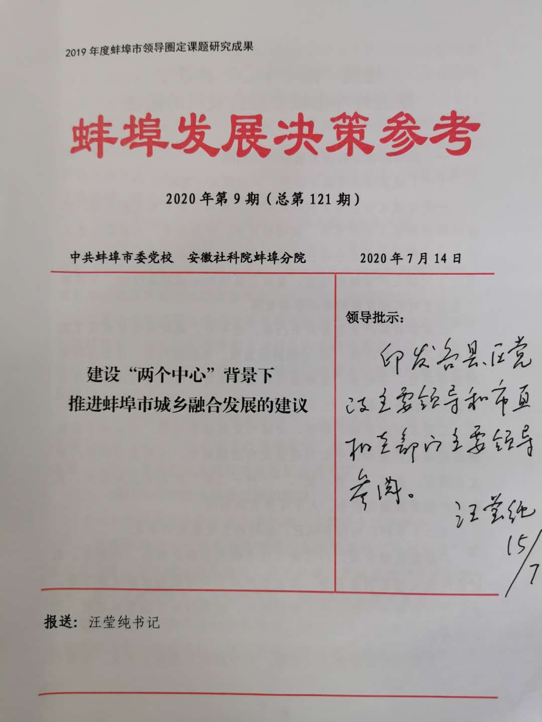 近日,由我校管理学院赵伟峰教授撰写智库研究报告《建设“两个中心”背景下推进蚌埠市城乡融合发展的建议》,获得蚌埠市委书记汪莹纯同志明确批示。批示全文:“印发各县区党政主要领导和市直机关部门主要领导参阅”。