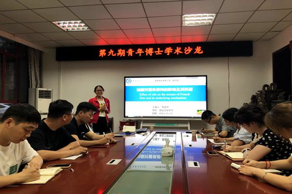 食品工程学院李培燕博士作了题为“油脂对薯条质构的影响及其机制”的学术报告。李培燕首先介绍了薯条质构的测定方法,明确了影响薯条质构的关键因子,揭示了油脂影响薯条质构的机制,最后通过合理的实验设计进一步论证了上述规律和机制,并初步给出了适用于薯条煎炸油的饱和度范围。该研究为开发薯条专用煎炸调和油提供了有力支撑,同时也为深入理解油脂对薯条质构的影响机制提供了新见解。与会师生讨论热烈,李培燕博士对师生提出的问题进行了耐心细致地解答,并分享了科学研究的心得体会。