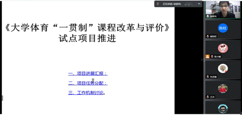 5月11日晚,体育教学部通过线上会议形式召开了《大学体育“一贯制”课程改革与评价》第2次工作汇报暨课题组第1次工作会议,会议主要围绕项目进展汇报、项目任务分配、工作机制等事项展开讨论,体育教学部党总支书记何俊如、体育教学部主任孙志双及课题组人员参加了会议。会议由体育教学部主任孙志双主持。