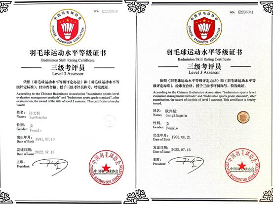 体育教学部两位教师获羽毛球运动水平等级评定三级考评员资质