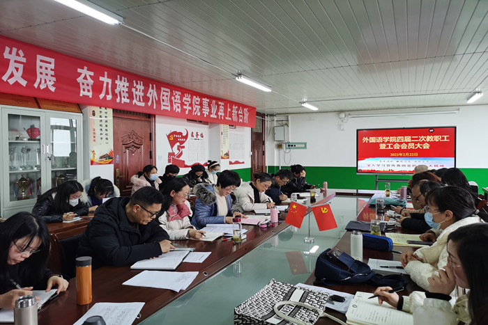 2月22日下午,外国语学院在学院会议室召开四届二次教职工暨工会会员大会。学院党政领导、工会主席以及全体教职工参加会议。会议由学院党委书记蔡为青主持。