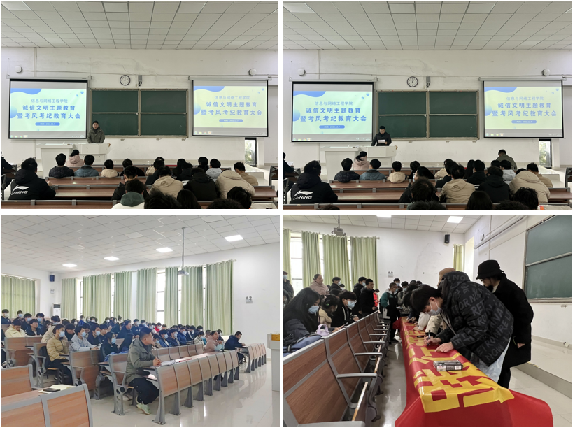 为进一步提高学生诚信文明素养,加强考风考纪教育。12月7日中午,信息与网络工程学院于致知楼C111召开诚信文明主题教育暨考风考纪教育大会。信息与网络工程学院党委副书记、纪委书记韦乃学,专职辅导员陈凯、李军成、崔北坤出席本次大会,22级各班班委及学生会干部参加本次大会,大会由陈凯主持。