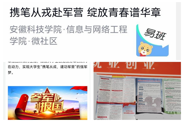 12月2日-18日,我院利用易班微社区平台组织学生学习大学生征兵政策,同时在学生宣传栏中张贴征兵政策的宣传单,以普及兵役法规政策、弘扬崇军尚武精神和激发参军报国热情为主线,激发大学生自觉投身军营的内在动力,实现大学生“携笔从戎,建功军营”的强军梦。