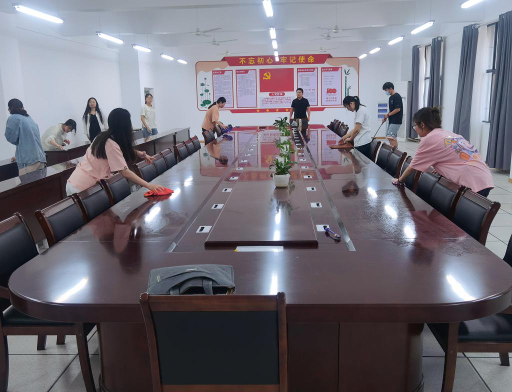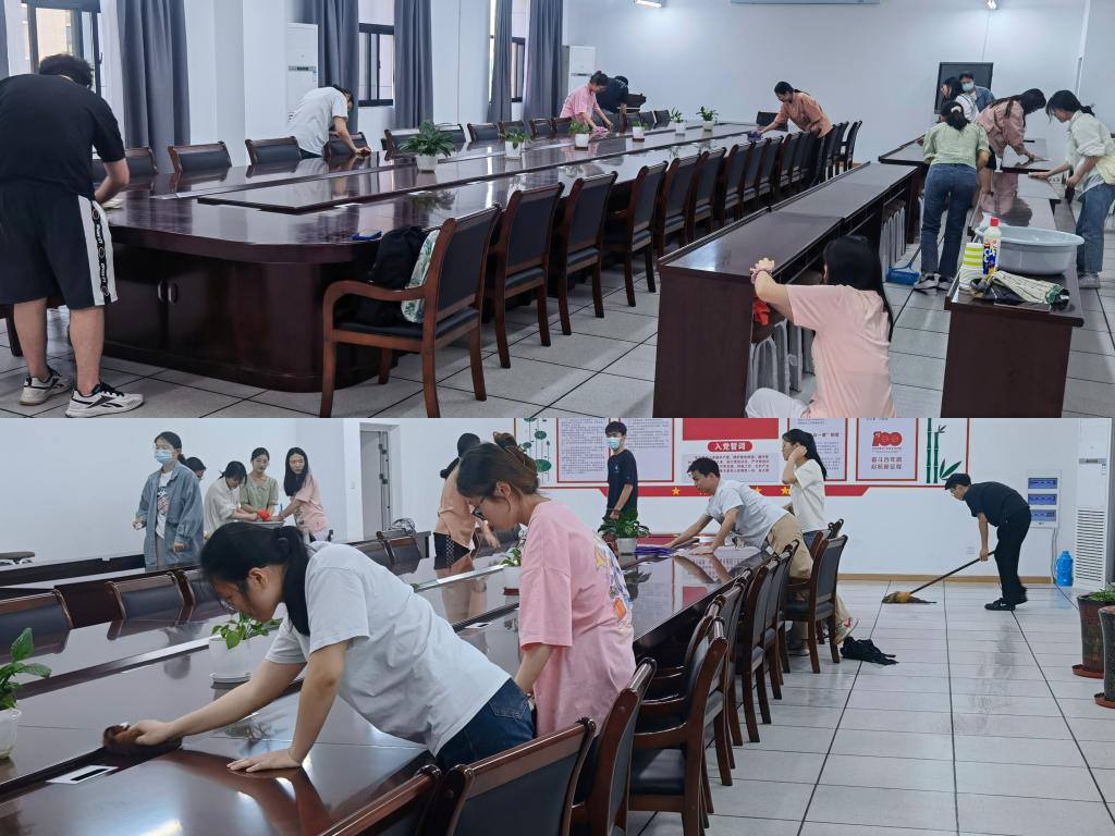 活动中,大数据专业学生党支部全体党员根据前期工作安排和任务的划分,各自从宿舍带来抹布、拖把、水桶以及84消毒液等清扫工具,有条不紊地对学院学生自习室、会议室展开卫生大扫除,学生党员们仔细认真清洁擦拭着讲台、桌椅、会议桌、投影仪、窗台以及窗户玻璃等每个角落,忙碌的身影在教室、会议室内不停地回来穿梭,以确保能够将学院学生自习室、会议室的每个角落都打扫干净、不留死角,使自习室和会议室一尘不染、焕然一新。