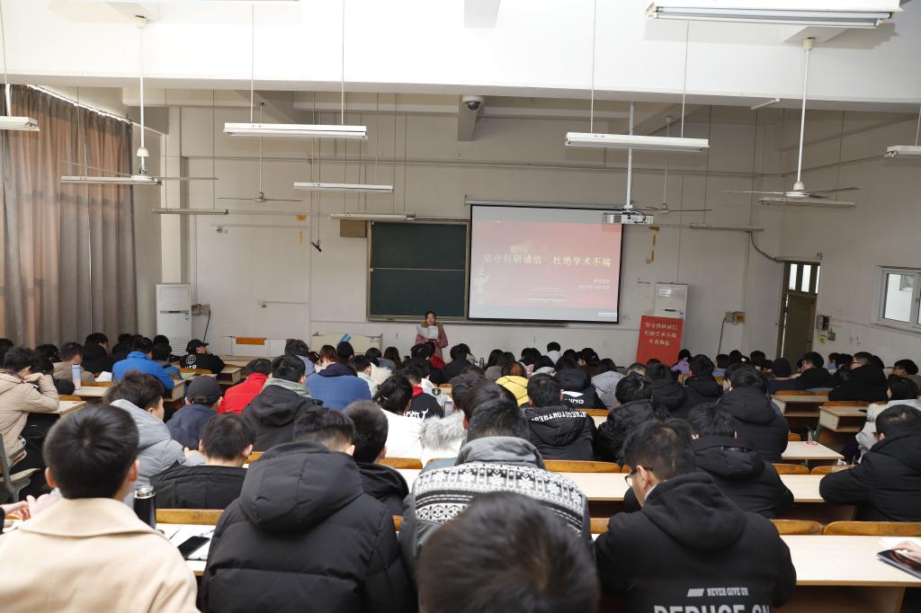 兰彬在会上强调,科研是科技创新的基石,对于学术不端行为我们要坚决杜绝,保持零容忍的态度。她简明扼要的为同学们解读了各个文件的内容,学习了相关的文件精神,强调了学术不端行为性质的恶劣与科研诚信的重要性。她告诉同学们在任何方面都应该诚信,在实践、科学研究及相关活动过程中应遵守相关学术规范要求,同时她还明确了国家对于学术不端行为调查处理的执行力度。告诫同学们应当以诚信为本,以科学严谨的态度,脚踏实地一步一个脚印开展学术研究,自觉抵制学术不端行为,恪守学术纪律底线。