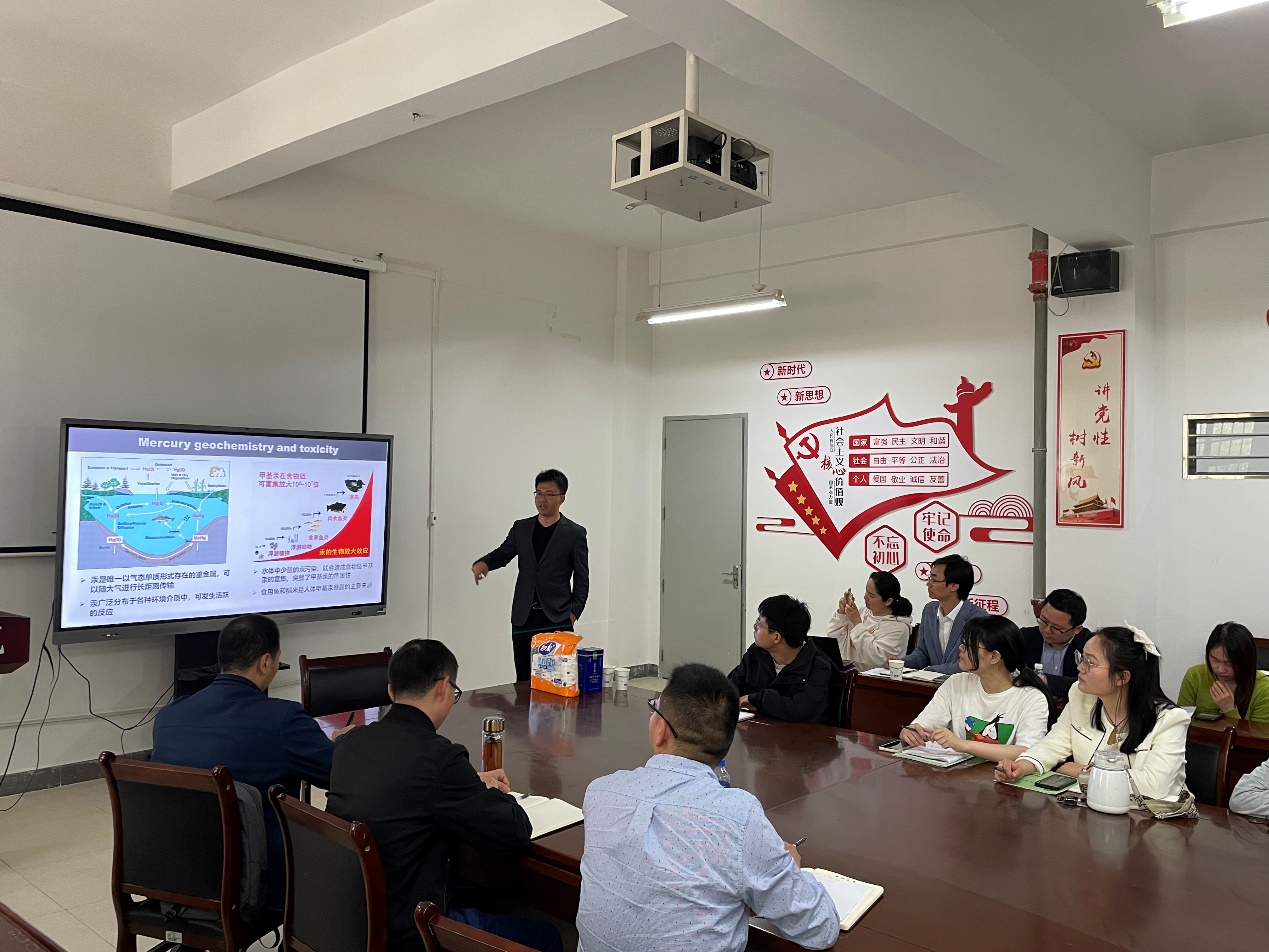 周俊研究员以《大气-地表重金属交换通量及其环境效应研究》为题,聚焦森林中汞的交换通量和水稻对大气沉降镉的富集,系统介绍大气-地表重金属迁移和富集等研究成果。报告会后,周俊研究员与参会师生进行了热烈的讨论,细致解答了师生提出的相关问题。