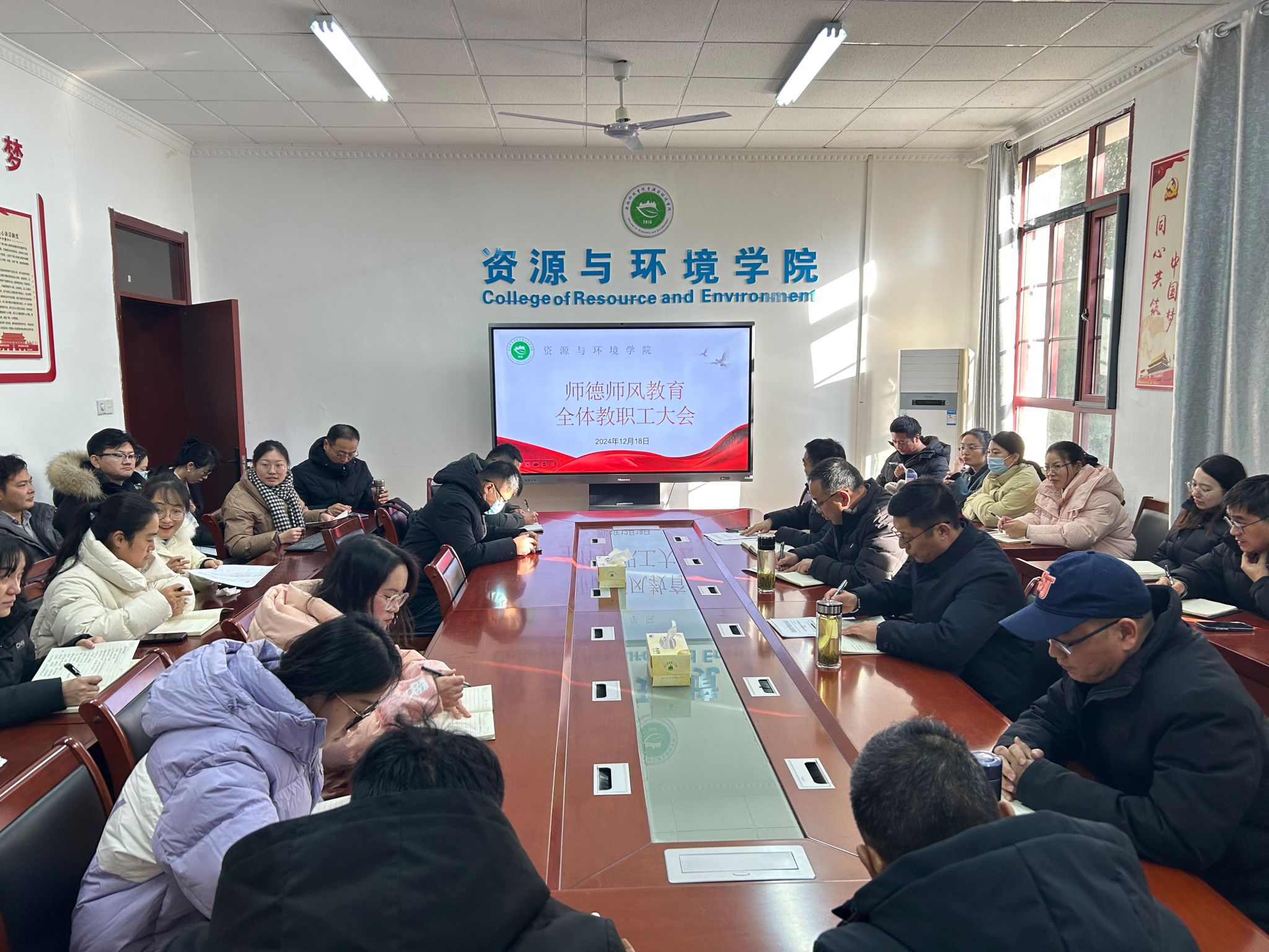12月18日下午,资源与环境学院于东办公楼学院会议室召开师德师风教育暨全体教职工大会,资源与环境学院党政领导以及全体教职工参会,会议由学院党委书记沈树周主持。