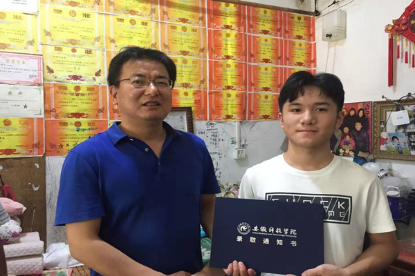 10日午间,在肥东县东方新城低矮的旧民居,黄友锐把录取通知书亲手交给2021级新生李惠康。李惠康以超一本线9分的成绩填报我校动物医学专业。得知李惠康父母均智力或身体残疾,由年迈的奶奶拉扯长大,黄友锐要求招生办负责人关心李惠康的报到入学,做好后续服务。