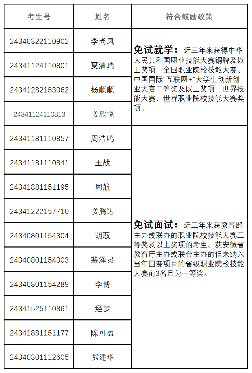 根据《云博网页版2024年面向中职毕业生对口招生章程》关于申请免试就学、免试面试和加分鼓励政策的相关要求,经考生申请,学校审核,共有李尚凤等4名考生符合免试就学政策,周浩鸣等10名考生符合技能大赛免试面试政策,无符合考试加分政策考生,现对符合相关鼓励政策的考生信息予以公布。免试就学资格复审和免试面试具体安排见通知公告栏“云博网页版2024年对口招生考试免试就学资格复审和免试面试工作通知”。如有异议或遗漏,请于4月3日17:00前联系云博网页版招生办公室:0550-6732041,0552-3197041。