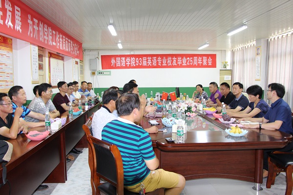 岁月如歌,共忆同窗往事,来日似锦,再叙师生情缘”。7月21日下午,外国语学院93届英语专业校友从祖国各地齐聚母校举行毕业25周年座谈会。原外国语学院党总支书记彭光明、校招生与就业工作处处长黄树桥、授课教师代表、外国语学院党政领导等应邀出席。